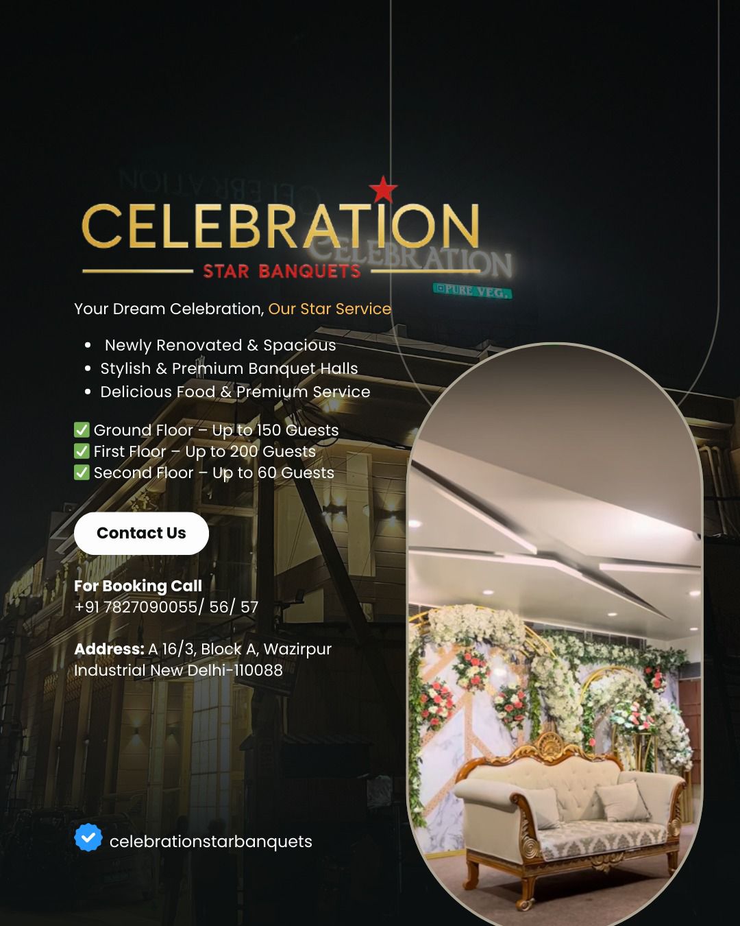 Celebration Star Banquets has been New Delhi’s preferred destination for exquisite events. Combining modern grandeur with timeless hospitality, our venue sets the scene for unforgettable memories. What makes us unique: personalized event planning, culinary masterpieces, stunning décor, and a legacy of delighted clients. Choose Celebration Star for weddings, corporate events, and every joyous occasion! We offer beautifully designed floors to suit every occasion: